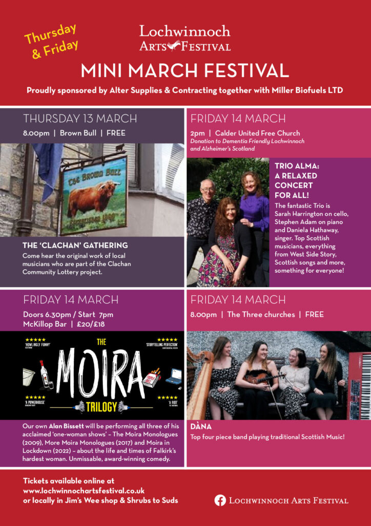 The Lochwinnoch Arts Festival is holding its Mini March Festival from 13th-16th March. The upcoming mini festival has a varied and inclusive programme with events for all ages, including a free concert from Dàna– an all female Scottish folk band and winner of of a Danny Kyle Award 2025. Highly recommended!